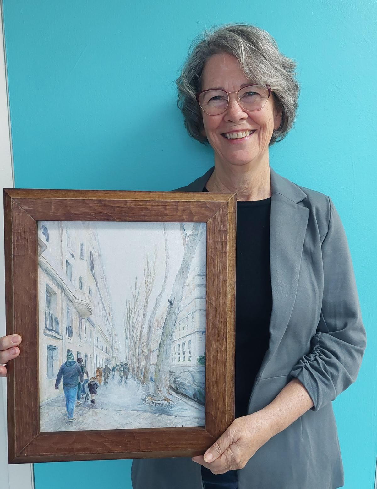 Debbe's piece, "Rue De Paris". is an oil painting that was inspired by a photograph taken in Paris in January 2020. Debbe and her family were visiting Paris at a time when there was one of many train strikes so they were forced to walk everywhere on this cloudy and drizzly day. The photo that was the inspiration for the painting includes her daughter, son-in-law and two grandchildren and is done in a limited palette of colors.